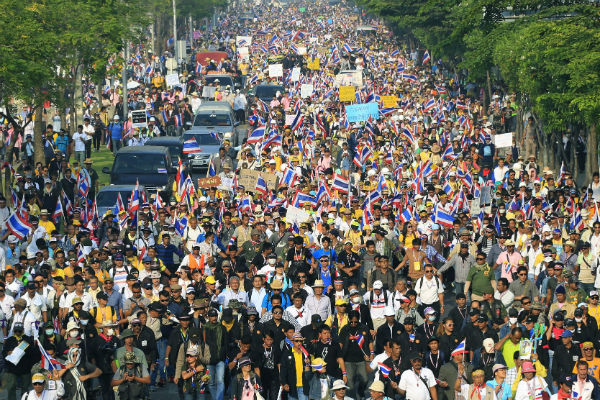 De protesten in de hoofdstad Bangkok zijn van een enorme omvang: de demonstraties gelden als de grootste sinds 2010.