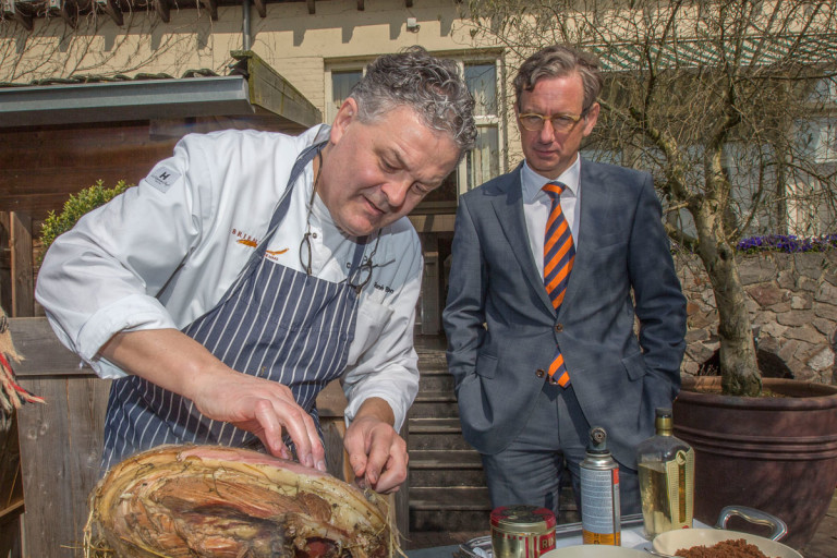 Als de fotograaf een foto maakt in de bar van het restaurant, draait directeur Arno Donkersloot van Hooghoudt snel de flessen jenever met het logo naar de camera.
