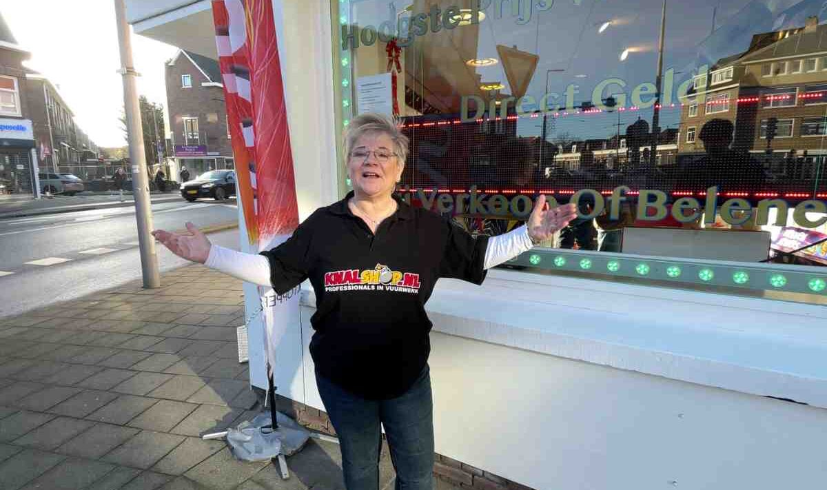 Op de op één na laatste dag van de legale vuurwerkverkoop in Nederland staat Cafferata trots achter haar toonbank.