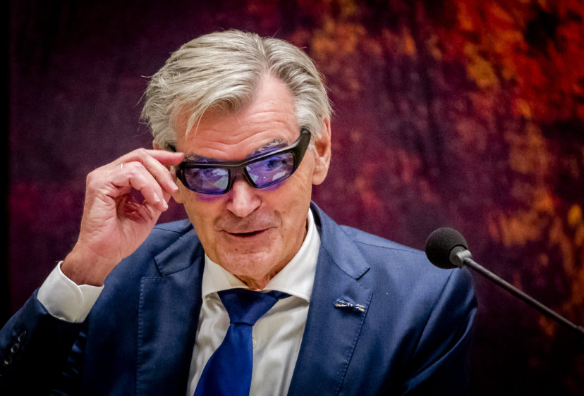 Martin van Rooijen (50Plus) test een lichttherapiebril om fit te blijven tijdens het debat over de afschaffing van de Wet-Hillen. ANP