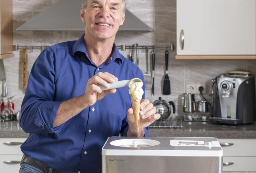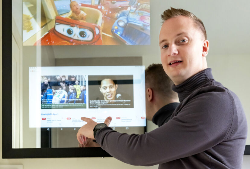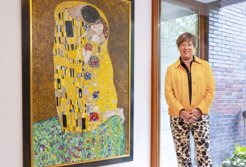 ‘Toen we vorig jaar de hal verbouwden, kwam er een stuk muur vrij waar De Kus zou kunnen hangen. Ik heb toen Dioni ten Busschen gevraagd om dit schilderij zo waarheidsgetrouw mogelijk te kopiëren.’