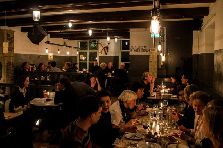 De meubels en de bar zijn afgewerkt met materiaal uit het pand zelf. Op de bakstenen muren uit 1843 is de later aangebrachte graffiti nog mooi te zien.
